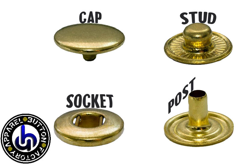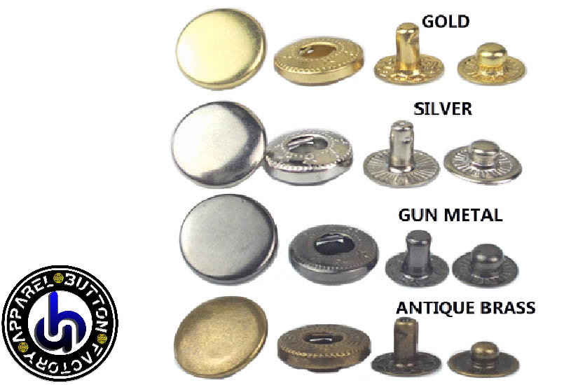 Snap buttons, also known as snap fasteners or press studs, are a popular type of closure mechanism used in a variety of applications, including clothing, bags, and accessories. They consist of two parts: a male part with a protruding stud, and a female part with a socket that snaps onto the stud to securely fasten the two pieces together. Snap buttons consist of 4 parts as Cap, Socket, Stud and Post. Cap part can be in different size and shape, plus cap also can be customized by customers logo. Snap buttons are typically made of metal or plastic and come in a range of sizes and colors to suit different needs and preferences. They are often used as a functional and decorative element, adding a touch of style and convenience to any design. Snap buttons can be electroplated to various metallic colors like silver color, gold color, bronze, copper, antique colors etc. Snap button caps also can be painted to any color like blue, red, green etc. One of the key advantages of snap buttons is their ease of use. They can be easily snapped and unsnapped with one hand, making them a convenient option for garments that need to be quickly opened or closed. In addition to their practicality, snap buttons also offer a secure and durable closure solution. They can withstand repeated use and are less likely to break or wear out over time compared to other types of closures like zippers or buttons. Overall, snap buttons are a versatile and reliable closure option that are popular in a wide range of applications. Whether you are designing clothing, bags, or accessories, snap buttons offer a functional and stylish solution for your closure needs.